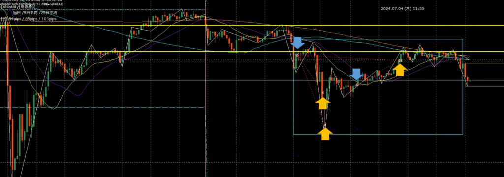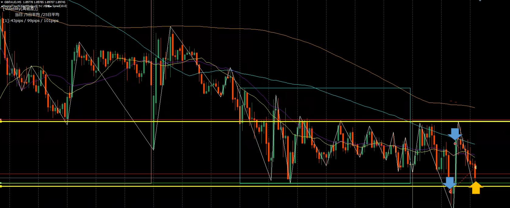 ・重要水平線(1時間でも)を勢いよく抜けたので、少し戻した所で飛び乗った。